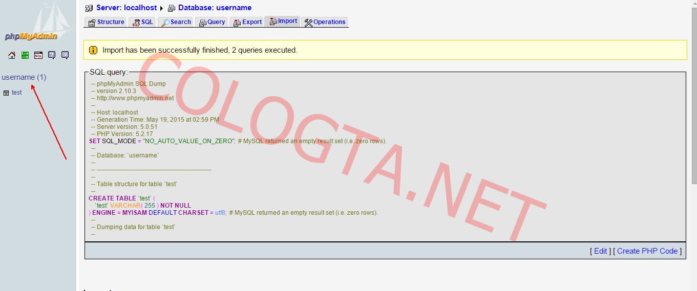 5.จะปรากฏดังภาพ เพื่อยืนยันว่านำเข้าไฟล์ดาต้าเบสเรียบร้อยแล้วหลังจากนั้นคลิกที่ ชื่อผู้ใช้ ด้านซ้ายมือเพื่อกลับไปหน้าฐานข้อมูลของเรา