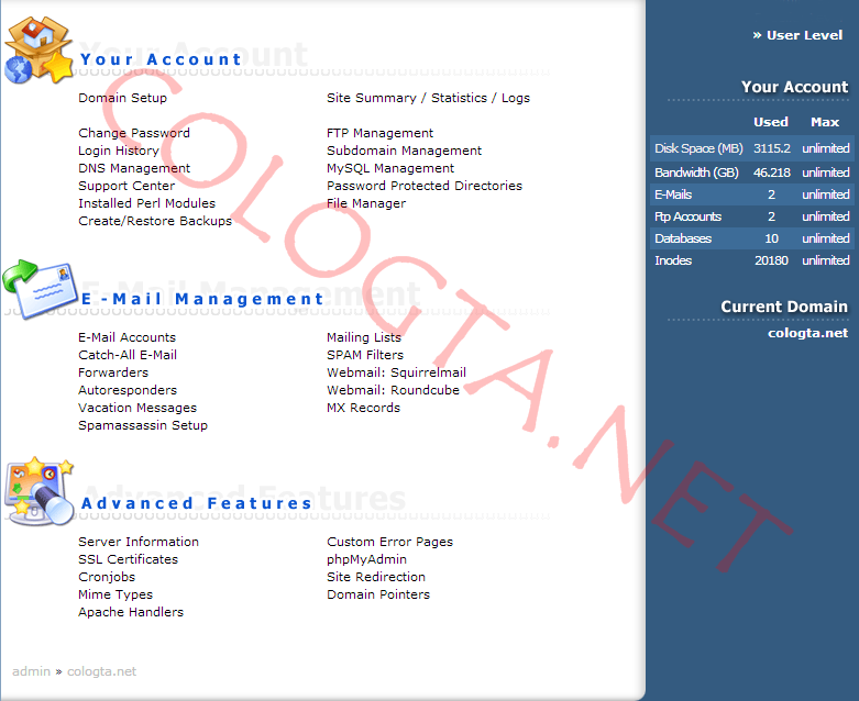 3. เมื่อเข้ามาสู่ระบบ Direct Admin Control Panel เรียบร้อยแล้วจะมีลักษณะดังนี้